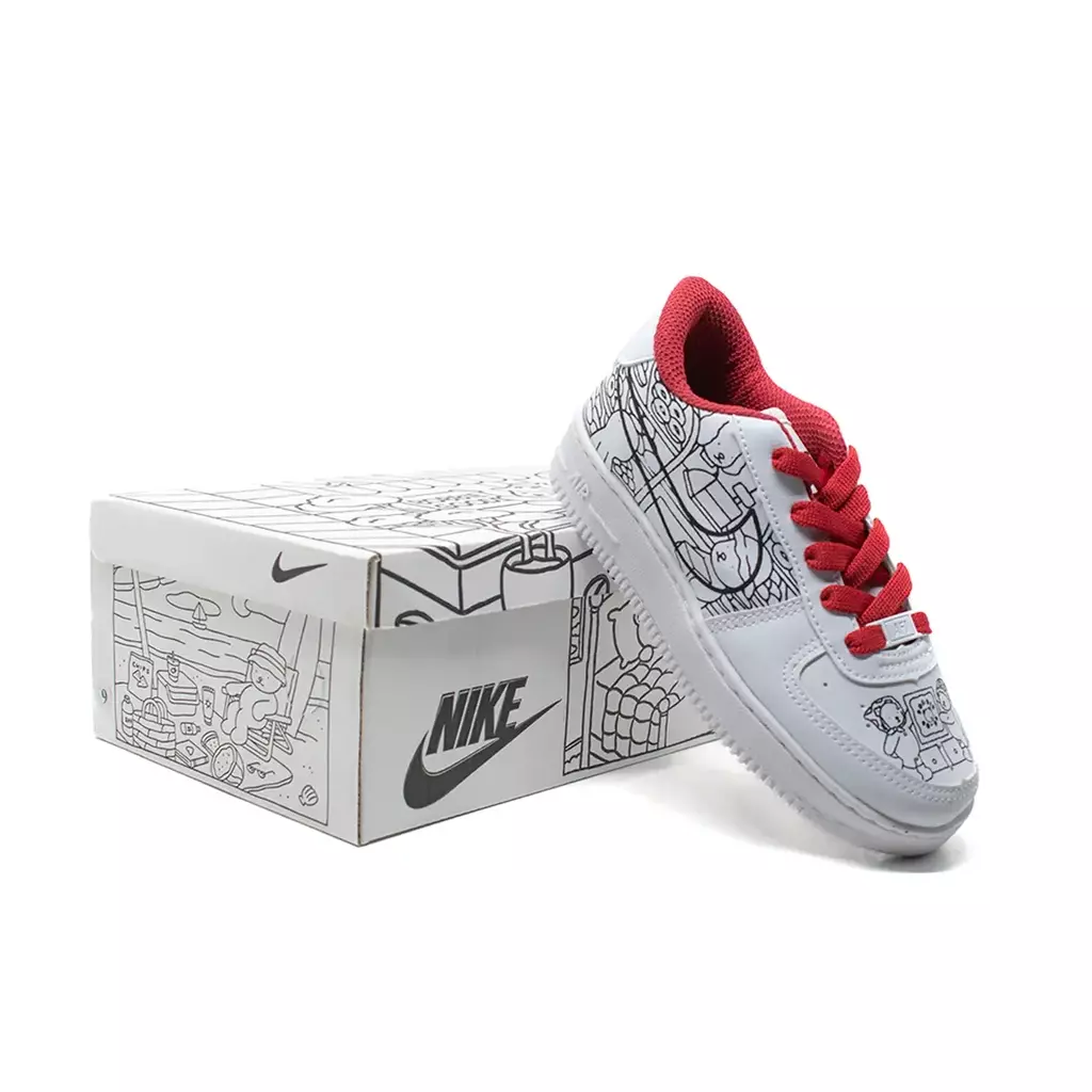 O cabedal em couro sintético branco traz desenhos em preto que remetem ao universo infantil e criativo, enquanto os cadarços e o forro em vermelho dão um contraste vibrante e moderno. Ideal para quem busca conforto no dia a dia, sem abrir mão do estilo.